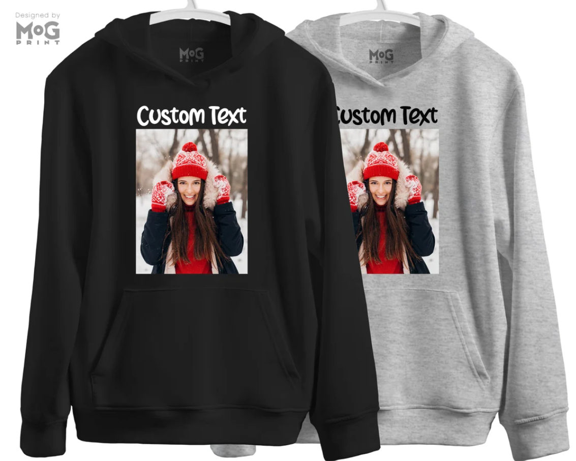 Hoodie dengan cetak foto pelanggan, baik full-print, face art, atau desain artistik khusus. Cocok sebagai hadiah spesial.